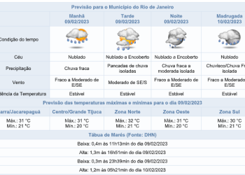 Noticias 9 de fevereiro de 2023 Quinta (09/02) com previsão de chuva ao longo do dia. Mínima deve ser de 20°c