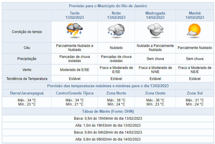 Na noite desta segunda-feira (13/02), áreas de instabilidade em médios níveis na atmosfera mantém o tempo instável, com previsão de pancadas de chuva isoladas, podendo vir acompanhadas de raios, informa o Sistema Alerta Rio. Os modelos numéricos de previsão do tempo indicam estimativa de chuva de 5 mm neste período.