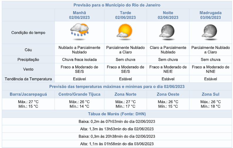 Ventos úmidos do oceano ainda influenciarão o tempo sobre a cidade do Rio de Janeiro nesta sexta-feira (02/06). O dia terá predomínio de céu parcialmente nublado e há previsão de chuva fraca de forma isolada no início da manhã. Os ventos estarão fracos a moderados e as temperaturas permanecerão estáveis, com máxima de 27°C.