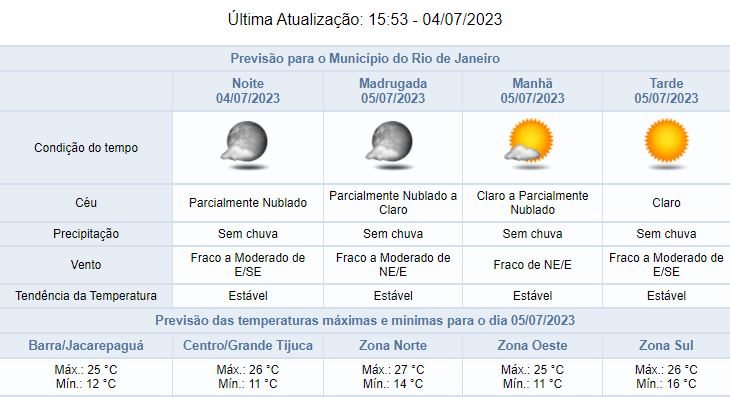 Segundo o Alerta Rio, na noite desta terça-feira (04/07), devido a atuação de um sistema de alta pressão, o tempo permanecerá estável na cidade do Rio de Janeiro, o céu estará parcialmente nublado e não há previsão de ocorrências de chuva. Nesta terça-feira, após a circulação de ventos úmidos vindos do oceano, a atuação de um sistema de alta pressão influenciou o tempo no Rio. O céu esteve parcialmente nublado a nublado com registros isolados de chuvisco na madrugada. Os ventos estiveram fracos a moderados e as temperaturas permaneceram estáveis em relação ao dia anterior, com mínima registrada de 11,3°C e máxima registrada de 25,3°C.