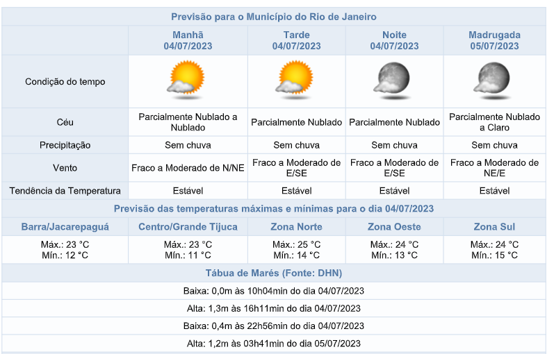 Após a entrada de umidade do oceano, um sistema de alta pressão no oceano ocasionará o tempo estável na cidade do Rio de Janeiro nesta terça-feira (04/07). O predomínio será de céu parcialmente nublado e não há previsão de chuva. Os ventos estarão fracos a moderados e as temperaturas permanecerão amenas e estáveis em relação ao dia anterior, com mínima de 11°C e máxima de 25°C.