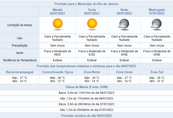 Segundo o Alerta Rio, a atuação de um sistema de alta pressão sobre o oceano manterá o tempo estável sobre a cidade do Rio de Janeiro nesta quinta-feira (06/07). O céu irá variar de claro a parcialmente nublado e não há previsão de chuva. Os ventos estarão fracos a moderados e as temperaturas permanecerão estáveis em relação ao dia anterior, com mínima de 12°C e máxima de 29°C.
