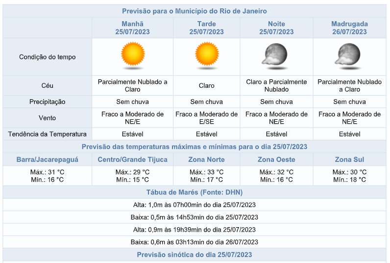 A atuação de um sistema de alta pressão sobre o oceano manterá o tempo estável sobre a cidade do Rio de Janeiro nesta terça-feira (25/07). O predomínio será de céu claro e não há previsão de chuva. Os ventos estarão fracos a moderados e as temperaturas permanecerão estáveis em relação ao dia anterior, com mínima de 15°C e máxima de 33°C.