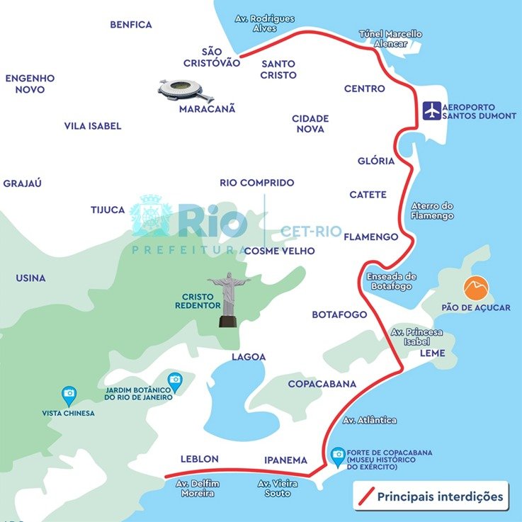 O Centro de Operações Rio, por meio da CET-Rio, informa que no domingo (30/07) diversas vias da Zona Sul e do Centro serão interditadas para viabilizar a Meia Maratona Rio S-21k.