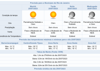 Noticias 25 de julho de 2023 Terça-feira (25/07) de tempo estável e calor no Rio. Máxima de 33°c. Confira a previsão para os próximos dias