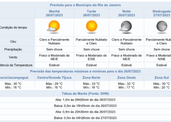 Noticias 26 de julho de 2023 Quarta-feira (26/07) de tempo estável e calor no Rio. Máxima de 33°c. Confira a previsão para os próximos dias