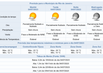 Noticias 4 de julho de 2023 Terça-feira fria no Rio com mínima de 11°c. O céu deve permanecer nublado mas sem previsão de chuva