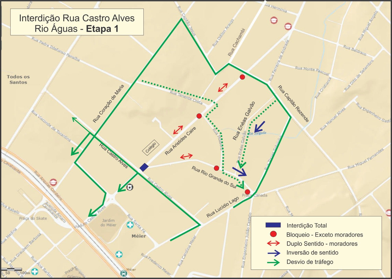 O Centro de Operações Rio, através da CET-Rio, informa que a partir das 22h de sexta-feira (04/08), o cruzamento das ruas Aristides Caire e Rio Grande do Sul, no Méier, será interditado para continuação das obras da Fundação Rio-Águas na galeria subterrânea da Rua Aristides Caire.