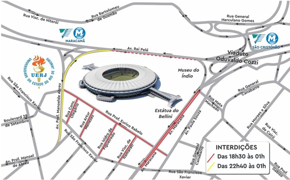 O acesso de veículos de moradores do entorno imediato ao Maracanã (ruas Prof. Eurico Rabelo, Visconde de Itamarati, Isidro de Figueiredo, Artur Menezes e Conselheiro Olegário) será feito, exclusivamente, pela Av. Paula Sousa e pela Rua Prof. Eurico Rabelo, mediante apresentação de comprovante de residência.