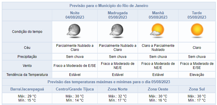 Segundo o Alerta Rio, para a noite desta sexta-feira (04/08), a previsão é de céu parcialmente nublado a claro, sem chuva na cidade do Rio de Janeiro. Nesta sexta-feira, a passagem de uma frente fria pelo oceano influenciou o tempo na cidade do Rio de Janeiro. O céu variou entre nublado e parcialmente nublado e não houve registro de chuva. Os ventos estiveram fracos a moderados e as temperaturas apresentaram declínio em relação ao dia anterior, com mínima de 15,7°C à 00h55min e a máxima registrada de 29,3°C às 14h30min.