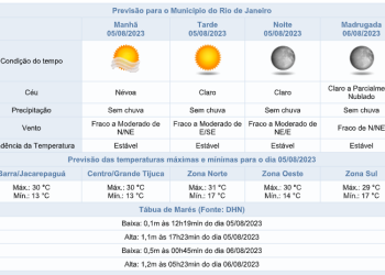 Noticias 5 de agosto de 2023 Sábado (05/08) tem previsão de tempo estável e máxima de 31ºC | Aviso de Ressaca segue vigente no Rio
