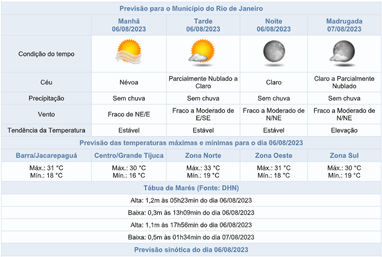 O posicionamento de um sistema de alta pressão sobre o oceano manterá o tempo estável sobre a cidade do Rio de Janeiro neste domingo (06/08). A cobertura do céu irá variar entre parcialmente nublado e claro, com ocorrência de névoa úmida no início da manhã, e não há previsão de chuva. Os ventos estarão fracos a moderados e as temperaturas permanecerão estáveis em relação ao dia anterior, com mínima de 16°C e máxima de 33°C.