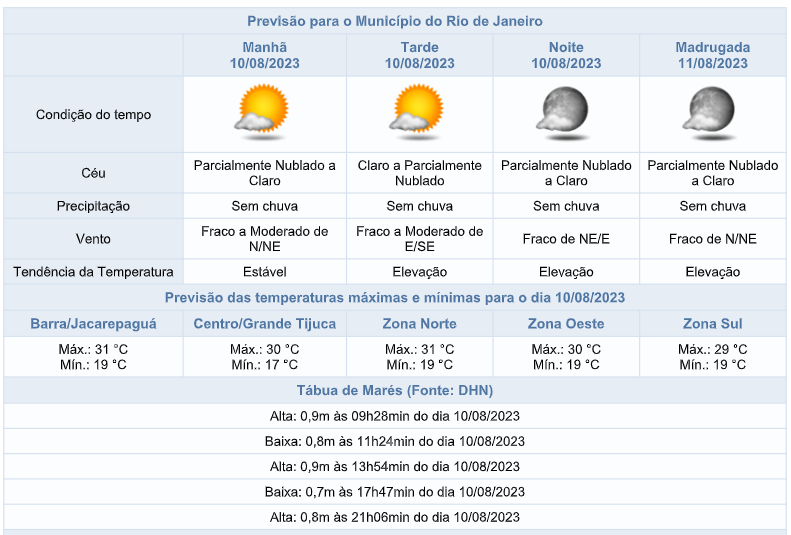 O posicionamento de um sistema de alta pressão influenciará o tempo na cidade do Rio de Janeiro nesta quinta-feira (10/08), com céu parcialmente nublado a claro e sem previsão de chuva. Os ventos estarão fracos a moderados e as temperaturas estarão em elevação em relação ao dia anterior, com máxima de 31°C.