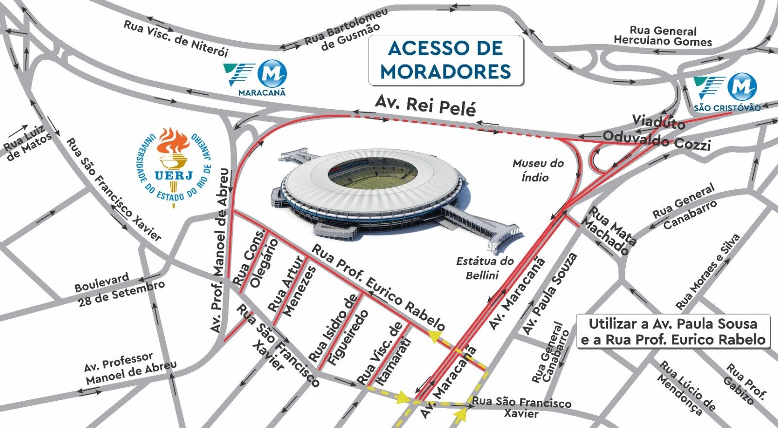 O acesso de veículos de moradores do entorno imediato ao Maracanã (ruas Prof. Eurico Rabelo, Visconde de Itamarati, Isidro de Figueiredo, Artur Menezes e Conselheiro Olegário) será feito, exclusivamente, pela Av. Paula Sousa e a Rua Prof. Eurico Rabelo, mediante apresentação de comprovante de residência.