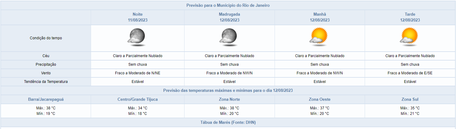 De acordo com o Alerta Rio, entre a noite de sexta-feira (11/08) e o sábado (12/08), o tempo estará estável na cidade do Rio de Janeiro. Com céu claro a parcialmente nublado e sem previsão de chuva. Os ventos estarão fracos a moderados e as temperaturas elevadas.Destaca-se que, no período da tarde de sábado (12/08), a umidade relativa do ar poderá apresentar valores próximos de 30%.