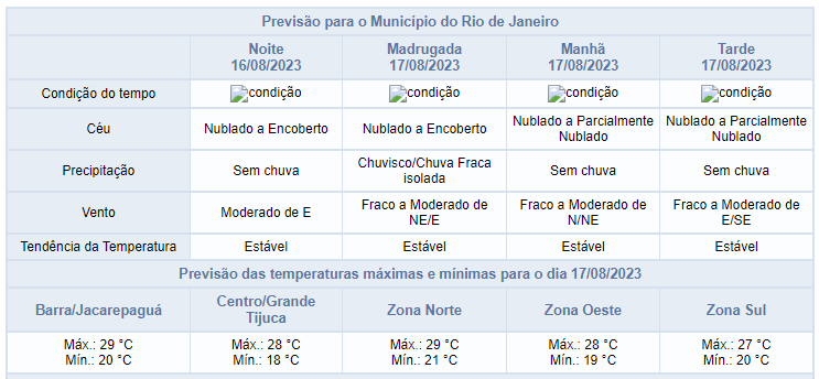Segundo o Alerta Rio, nesta noite de quarta-feira (16/08), o céu estará nublado a encoberto sobre a cidade do Rio de Janeiro e não há previsão de chuva. Os ventos estarão moderados. Quarta-feira de céu nublado a encoberto sobre a cidade do Rio de Janeiro, com registro de chuviscos isolados durante a manhã. Os ventos estiveram fracos a moderados e as temperaturas permaneceram estáveis em relação ao dia anterior, com mínima registrada de 18,3°C às 05h40min na estação Alto da Boa Vista e máxima registrada de 29,7°C às 15h05min na estação Irajá.