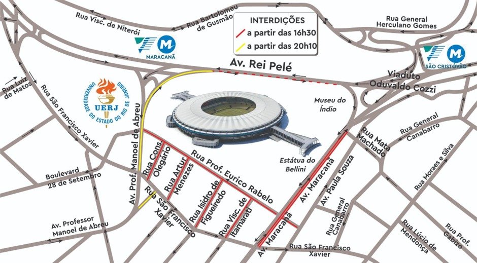 O acesso de veículos de moradores do entorno imediato ao Maracanã (ruas Prof. Eurico Rabelo, Visconde de Itamarati, Isidro de Figueiredo, Artur Menezes e Conselheiro Olegário) será feito, exclusivamente, pela Av. Paula Sousa e pela Rua Prof. Eurico Rabelo, mediante apresentação de comprovante de residência.