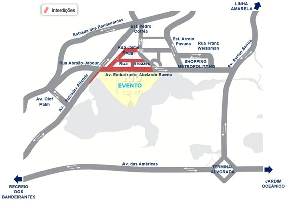 Os veículos provenientes do Centro, via Linha Amarela, deverão utilizar a Av. Ayrton Senna, Av. das Américas e Av. Benvindo de Novaes.
