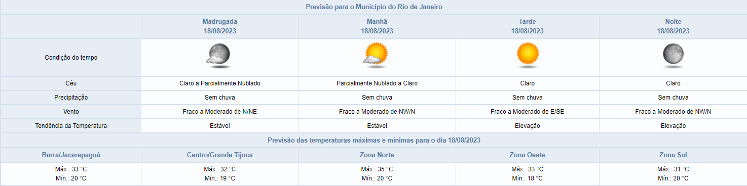 Segundo o Sistema Alerta rio, o posicionamento de um sistema de alta pressão influenciará o tempo na cidade do Rio de Janeiro nesta sexta-feira (18/08). Haverá predomínio de céu claro e não há previsão de chuva. Os ventos estarão fracos a moderados e as temperaturas estarão em elevação em relação ao dia anterior, com mínima de 21°C e máxima de 36°C.