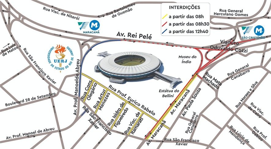 O acesso de veículos de moradores do entorno imediato ao Maracanã (ruas Prof. Eurico Rabelo, Visconde de Itamarati, Isidro de Figueiredo, Artur Menezes e Conselheiro Olegário) será feito, exclusivamente, pela Av. Paula Sousa e pela Rua Prof. Eurico Rabelo, mediante apresentação de comprovante de residência.