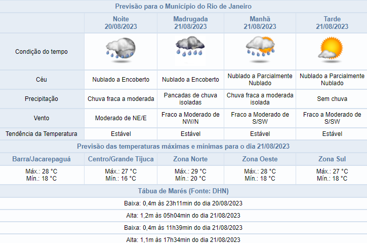 Na quinta-feira (24/08), a aproximação de uma frente fria deixará o tempo instável sobre a cidade do Rio de Janeiro, com previsão de pancadas de chuva moderada no período da noite. Os ventos estarão moderados a fortes (acima de 52km/h).