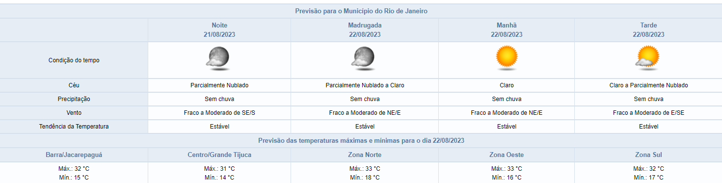 Segundo o Alerta Rio, nesta noite de segunda-feira (21/08), o céu estará parcialmente nublado e não há previsão de chuva. Na terça-feira (22/08), o tempo estará estável, com céu claro a parcialmente nublado. Não há previsão de chuva e as temperaturas apresentarão elevação.