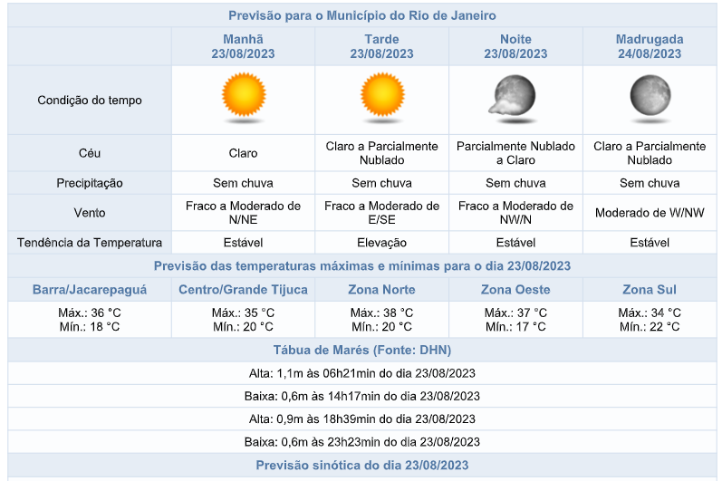 A quarta-feira (23/08) será de tempo estável na cidade do Rio de Janeiro devido à um sistema de alta pressão sobre o oceano. Desta forma, o céu estará claro a parcialmente nublado e sem chuva. Os ventos estarão fracos a moderados e as temperaturas ficarão em elevação em relação ao dia anterior, com mínima de 17°C e máxima de 38°C.