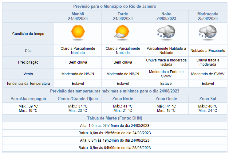 Segundo o Alerta Rio, devido à aproximação de uma frente fria pelo oceano, nesta quinta-feira (24/08), haverá aumento de nebulosidade na cidade do Rio de Janeiro. Previsão de chuva fraca a moderada, de forma isolada, a partir do final da noite. Os ventos estarão moderados (entre 18,5 km/h a 51,9 km/h), com rajadas ocasionalmente fortes (entre 52 km/h a 76 km/h) e as temperaturas permanecerão estáveis em relação ao dia anterior, com mínima de 19°C e máxima de 41°C.
