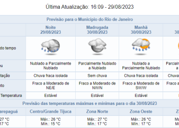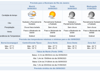 Noticias 30 de agosto de 2023 Chuva segue no rio nesta quarta-feira (30/08). Mínima de 18°c. Confira a previsão para os próximos dias.