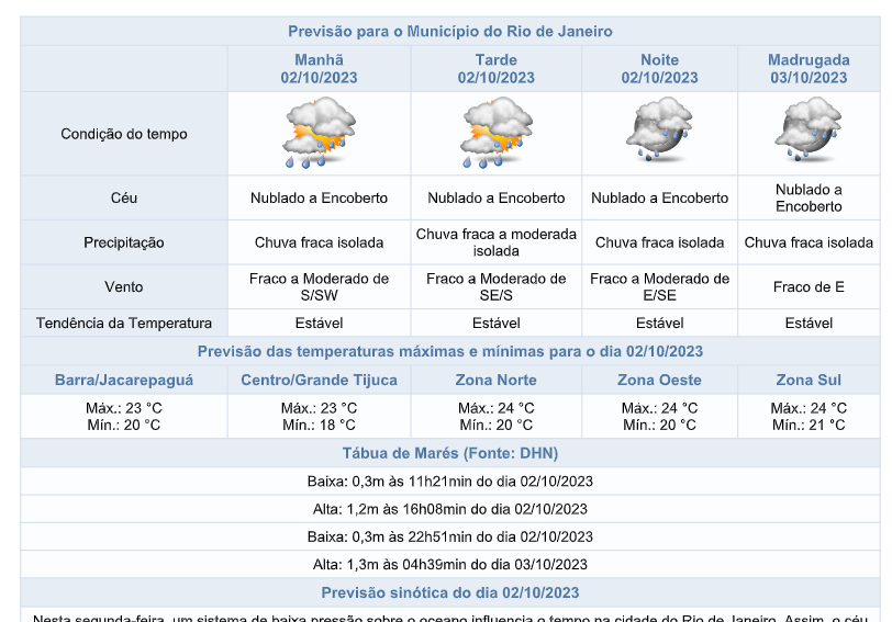 Nesta segunda-feira (02/10), um sistema de baixa pressão sobre o oceano influencia o tempo na cidade do Rio de Janeiro. Assim, o céu estará nublado a encoberto e há previsão de chuva fraca a ocasionalmente moderada, de forma isolada, a qualquer momento do dia. Os ventos estarão fracos a moderados e as temperaturas estarão estáveis, com mínima de 18°C e máxima de 24°C.
