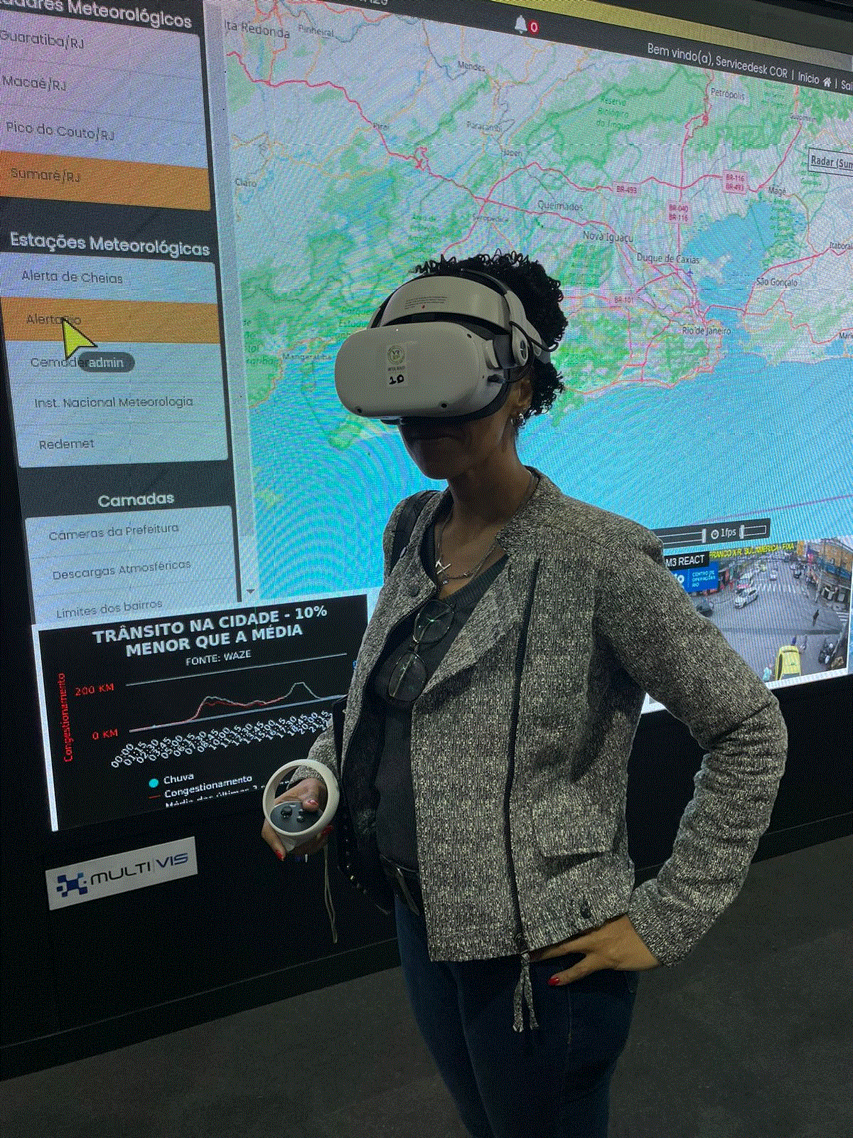 O COR encerrou o primeiro dia de Rio Innovation Week com grande repercussão. Além das palestras, os óculos de realidade virtual fizeram sucesso no estande. Aline Oliveira (foto acima), professora do Ensino Fundamental da Prefeitura do Rio, achou a experiência muito interessante. “Eu adoro o COR e, geralmente, assisto ao Bom Dia Rio, na Globo, e o Fachel sempre mostra o Centro de Operações, a Sala de Situação. Fico feliz em saber que vocês trabalham de maneira integrada, com vários órgãos na atividade”, comentou Aline.