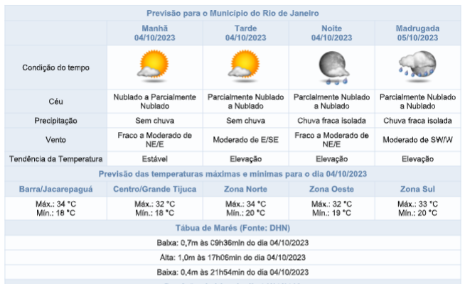 Segundo o Alerta Rio, nesta quarta-feira (04/10), a aproximação de uma frente fria pelo oceano influenciará o tempo na cidade do Rio de Janeiro. Assim, o céu estará parcialmente nublado a nublado e há previsão de chuva fraca isolada durante o período da noite. Os ventos estarão fracos a moderados (até 51,9 km/h) e as temperaturas estarão em elevação, com mínima de 18°C e máxima de 34°C.