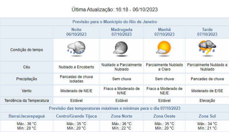 Segundo o Alerta Rio, nesta noite de sexta-feira (06/10), há previsão de pancadas rápidas de chuva moderada. A chuva poderá passar de 5mm/h. Áreas de instabilidade em médios níveis da atmosfera influenciaram o tempo sobre a cidade do Rio de Janeiro nesta sexta-feira, com variação de nebulosidade ao longo do dia e registros de chuva fraca a moderada durante a madrugada e manhã. Os ventos estiveram fracos a moderados e as temperaturas permaneceram estáveis em relação ao dia anterior, com mínima registrada de 21,3°C e máxima registrada de 33,5°C.