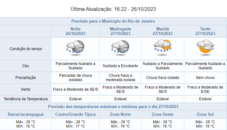 Na sexta-feira (27/10), o céu estará nublado a parcialmente nublado sobre a cidade do Rio de Janeiro, com previsão de chuva fraca a moderada de forma isolada na madrugada e manhã. A chuva poderá passar de 5mm/h.