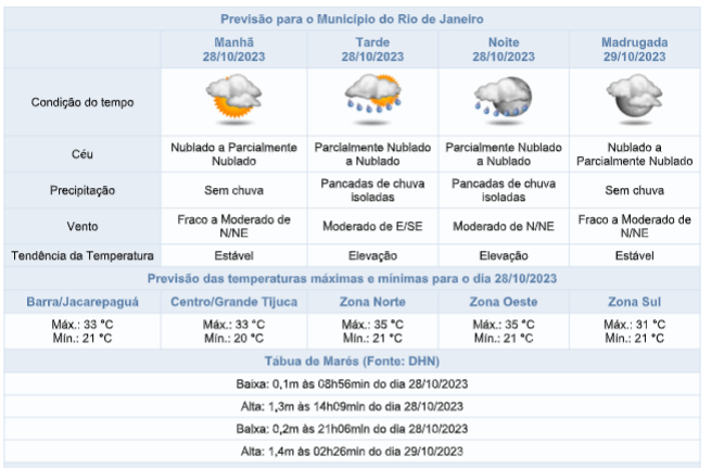 Segundo o Alerta Rio, neste sábado (28/10), áreas de instabilidade em médios e altos níveis da atmosfera, associadas ao calor e à umidade, deixarão o tempo instável na cidade do Rio de Janeiro. Assim, o céu estará parcialmente nublado a nublado, com previsão de pancadas isoladas de chuva moderada a partir do final da tarde. As temperaturas apresentarão elevação acentuada, com mínima de 20°C e máxima de 35°C, e os ventos estarão moderados (entre 18,5 km/h a 51,9 km/h), com pontuais rajadas fortes (entre 52 km/h a 76 km/h).
