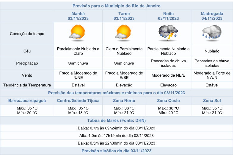 Nesta sexta-feira (03/11), áreas de instabilidade associadas à aproximação de uma frente fria no oceano influenciarão o tempo na cidade do Rio de Janeiro. Assim, a cobertura do céu irá variar entre claro e parcialmente nublado, passando a nublado à noite e há previsão de pancadas de chuva moderada, ocasionalmente forte, acompanhadas de raios durante a noite. As temperaturas apresentarão elevação acentuada, com mínima de 18°C e máxima de 36°C.