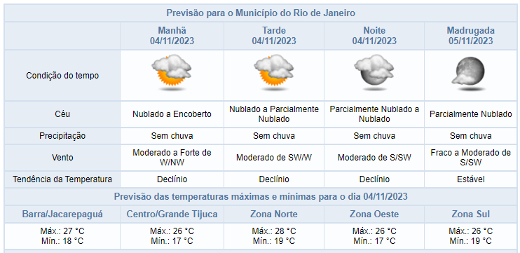 Entre domingo (05/11) e quarta-feira (08/11), haverá redução de nebulosidade na cidade e não há previsão de chuva. Os ventos estarão moderados, ocasionalmente fortes no domingo (05/11), e as temperaturas apresentarão gradual elevação durante o período. Neste sábado, o transporte de umidade do oceano para o continente influenciará o tempo na cidade do Rio de Janeiro. Assim, o predomínio será céu encoberto, mas sem ocorrência de chuva, com ventos moderados a fortes principalmente no período da manhã. As temperaturas apresentarão declínio, com mínima de 17°C e máxima de 29°C.