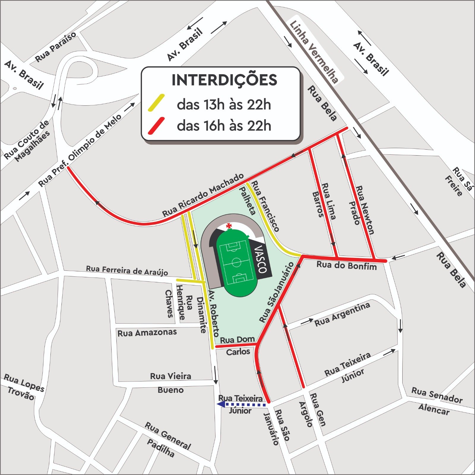 Segunda-Feira (06/11), das 16h às 22h: a Rua Teixeira Júnior funcionará no sentido da Rua São Januário para a Av. Roberto Dinamite.