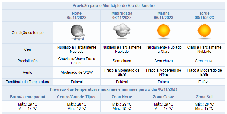 Segundo o Alerta Rio, nesta noite de domingo (05/11), o céu estará parcialmente nublado a nublado sobre a cidade, com previsão de chuviscos isolados. Os ventos estarão moderados (até 51,9 km/h). Domingo (05/11) de variação de nebulosidade sobre a cidade do Rio de Janeiro. Não houve registro de chuva e os ventos ficaram fracos a moderados. As temperaturas permaneceram estáveis em relação ao dia anterior, com mínima registrada de 17,6°C às 05h00min e máxima registrada de 27,6°C às 10h00min.