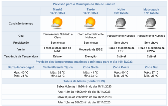 Segundo o Alerta Rio, nesta quinta-feira (16/11), as condições atmosféricas na cidade do Rio de Janeiro serão influenciadas por um sistema de alta pressão, que manterá o tempo estável. Assim, o céu estará claro a parcialmente nublado ao longo do dia, sem previsão de chuva. Os ventos estarão fracos a moderados (até 51,9 km/h) e as temperaturas apresentarão elevação, com mínima de 22°C e máxima de 41°C. A umidade relativa do ar poderá apresentar valores entre 21% e 30% no período da tarde em alguns pontos da cidade.