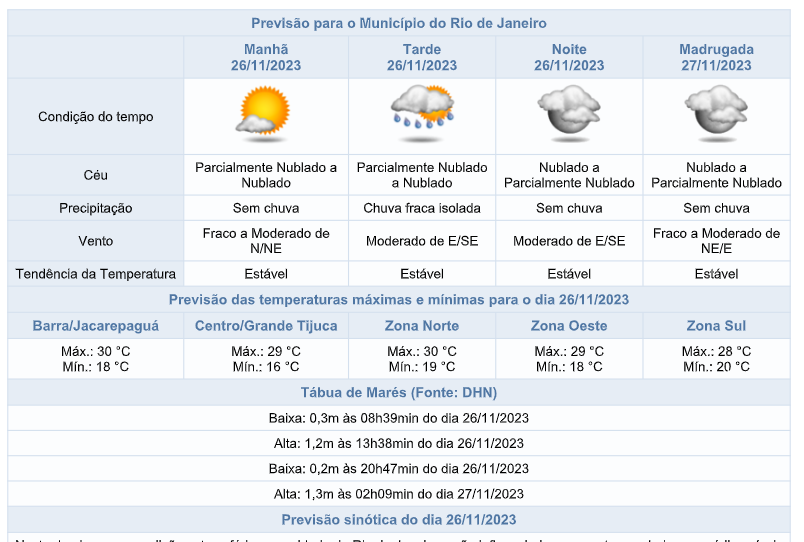 Na quarta e quinta-feira (29 e 30/11), instabilidades associadas à formação de um sistema de baixa pressão sobre o oceano influenciarão o tempo na cidade do Rio de Janeiro, com previsão de pancadas de chuva moderada a forte a partir da manhã de quarta-feira (28/11) , acompanhadas de raios e rajadas de vento moderado/forte (acima de 51,9 km/h) e a qualquer momento da quinta-feira (30/11). A chuva poderá passar de 6,4mm/15min em pelo menos um ponto da cidade.