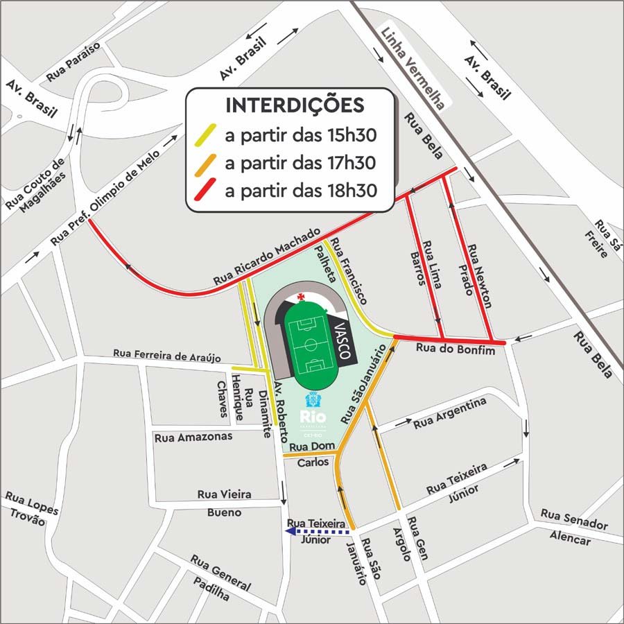 Terça-feira (28/11), das 17h30 às 00h30 do dia seguinte: A Rua Teixeira Júnior funcionará no sentido da Rua São Januário para a Av. Roberto Dinamite.