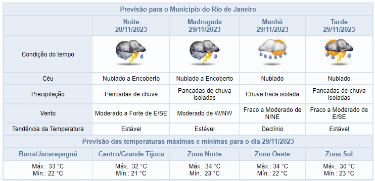 Na quarta-feira (29/11), instabilidades associadas ao deslocamento de um sistema de baixa pressão sobre o oceano influenciarão o tempo no Rio, com previsão de pancadas de chuva moderada a forte durante o início da madrugada e nos períodos da tarde e noite. Estas pancadas poderão vir acompanhadas de raios. A chuva poderá passar de 6,4mm/15min. As temperaturas estarão estáveis.