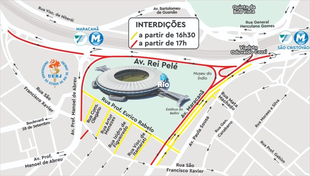 O acesso de veículos de moradores do entorno imediato ao Maracanã (ruas Prof. Eurico Rabelo, Visconde de Itamarati, Isidro de Figueiredo, Artur Menezes e Conselheiro Olegário) será feito, exclusivamente, pela Av. Paula Sousa e pela Rua Prof. Eurico Rabelo, mediante apresentação de comprovante de residência.