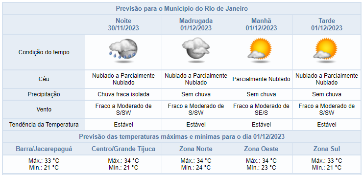 Segundo o Alerta Rio, a partir do final da tarde desta quinta-feira (30/11), devido ao calor e a disponibilidade de umidade, associado à presença de um sistema de baixa pressão próximo à costa da cidade do Rio de Janeiro, há previsão de chuva fraca isolada, até o período da noite. Chuva menor que 5mm/h. Nesta quinta-feira, as condições de tempo na cidade do Rio de Janeiro foram influencidas pelo posicionamento de um sistema de baixa pressão no oceano. Houve predomínio de céu parcialmente nublado e não houve registro de chuva e os ventos estiveram fracos a moderados. As temperaturas estiveram em elevação em relação ao dia anterior, com mínima registrada de 21,8°C às 05h10min e máxima registrada de 35,2°C às 13h10min.