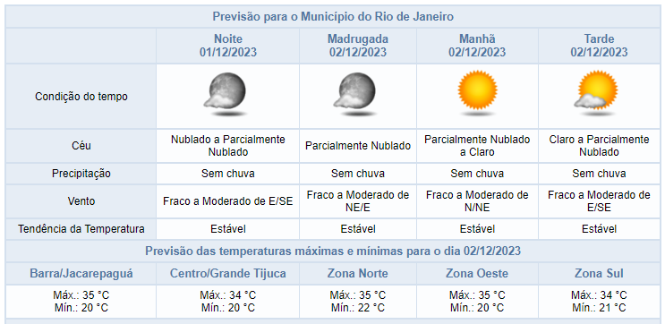 Segundo o Alerta Rio, nesta noite de sexta-feira (01/12), o céu estará parcialmente nublado sobre a cidade do Rio de Janeiro e não há previsão de chuva. Sexta-feira de variação de nebulosidade sobre a cidade, com céu nublado a parcialmente nublado ao longo do dia. Não houve registro de chuva e os ventos ficaram fracos a moderados. As temperaturas permaneceram estáveis em relação ao dia anterior, com mínima registrada de 21,0°C às 04h55min e máxima registrada de 33,5°C às 12h55min.