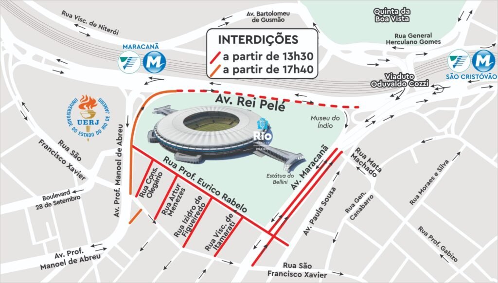 O acesso de veículos de moradores do entorno imediato ao Maracanã (ruas Prof. Eurico Rabelo, Visconde de Itamarati, Isidro de Figueiredo, Artur Menezes e Conselheiro Olegário) será feito, exclusivamente, pela Av. Paula Sousa e pela Rua Prof. Eurico Rabelo, mediante apresentação de comprovante de residência.
