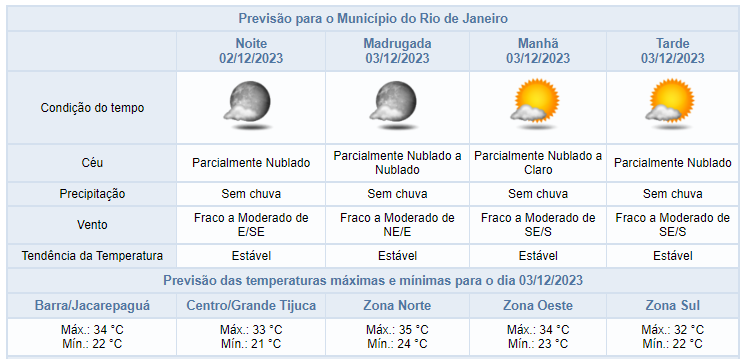 Segundo o Alerta Rio, nesta noite de sábado (02/12), o céu estará parcialmente nublado a claro na cidade do Rio de Janeiro e não há previsão de chuva. Este sábado, foi de tempo estável na cidade do Rio de Janeiro. O céu esteve parcialmente nublado a claro, não houve registro de chuva e os ventos estiveram fracos a moderados. As temperaturas permaneceram estáveis em relação ao dia anterior, com mínima registrada de 20,5°C às 04h00min e máxima registrada de 33,5°C às 11h35min.