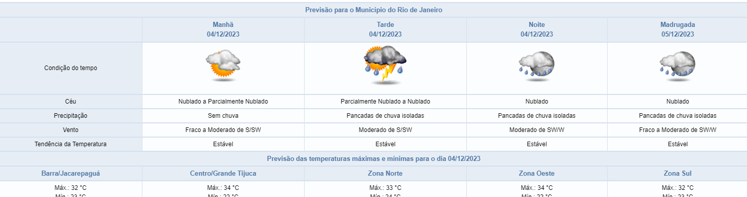 Na quarta-feira (06/12) e na quinta-feira (07/12), o tempo permanecerá instável sobre a cidade do Rio de Janeiro, com previsão de pancadas de chuva moderada a forte, nos períodos da tarde e noite destes dias. A chuva poderá passar de 6,4mm/15min em pelo menos um ponto da cidade.