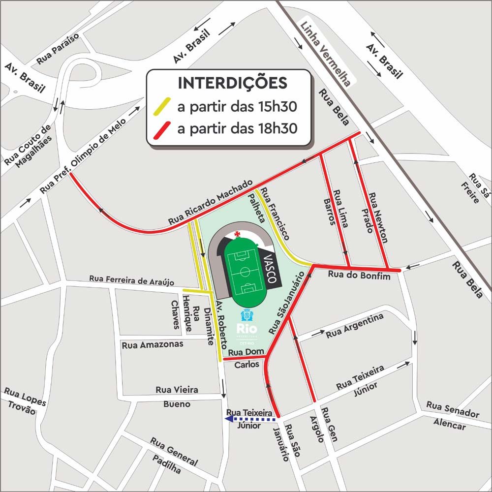 A Prefeitura do Rio elaborou uma operação especial para a partida entre Vasco e Bragantino, na próxima quarta-feira (06/12) às 21h30, em São Januário, válida pelo Campeonato Brasileiro de 2023. O Centro de Operações Rio, a CET-Rio e a Comlurb contarão com um efetivo de 176 agentes em diversas ações operacionais para proporcionar maior conforto ao torcedor que irá ao estádio. O esquema especial de tráfego, elaborado pela CET-Rio, prevê as seguintes interdições: